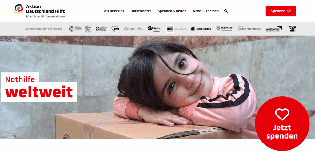 Der rote Spendenbutton von Aktion Deutschland Hilft sticht sofort ins Auge.