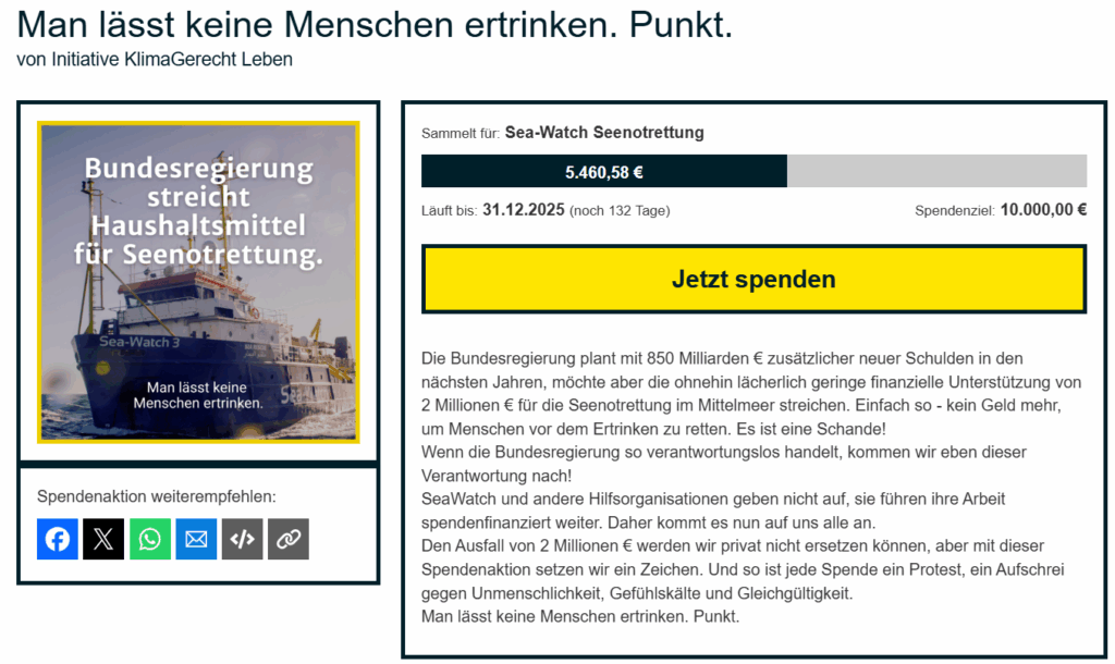Mit dem Spendenbarometer-Widget der FundraisingBox macht Sea-Watch Erfolge von Spendenaktionen direkt sichtbar.