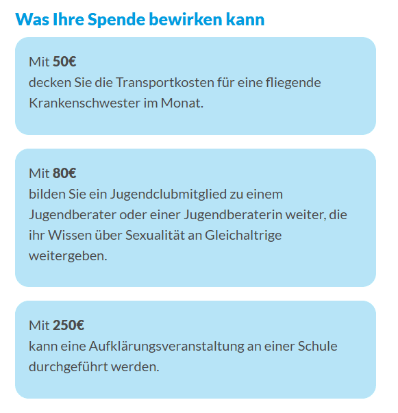 Die Spendenseite sollte nicht mit zu viel Text überladen werden, sondern den Nutzer*innen klar und überzeugend vermitteln, warum sie gerade jetzt und zugunsten Ihrer Organisation spenden sollten. Die zentralen Gründe dafür sollten nachvollziehbar und auf den Punkt gebracht sein. Besonders gut kann dies gelingen, wenn sie Ihren potenziellen Spender*innen anhand von Beispielen direkt zeigen, wofür ihre Spenden verwendet werden können.