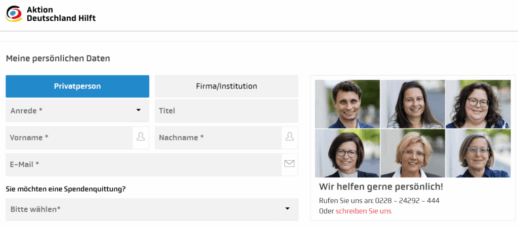 Ergänzen Sie das Spendenformular mit einem professionellen, sympathischen Foto einer Ansprechperson (z.B. aus dem Spendenservice) inklusive Namen und Kontaktdaten. Das macht Ihre Organisation nahbar, authentisch und weckt Vertrauen.