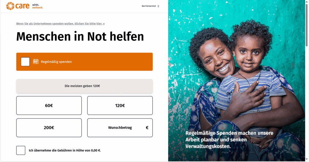 - Sehen Sie dezidiert Platz für ein separates Formular vor, das auf ein Dauerspenden-Programm fokussiert ist (z. B. Fördermitgliedschaften oder Patenschaften).