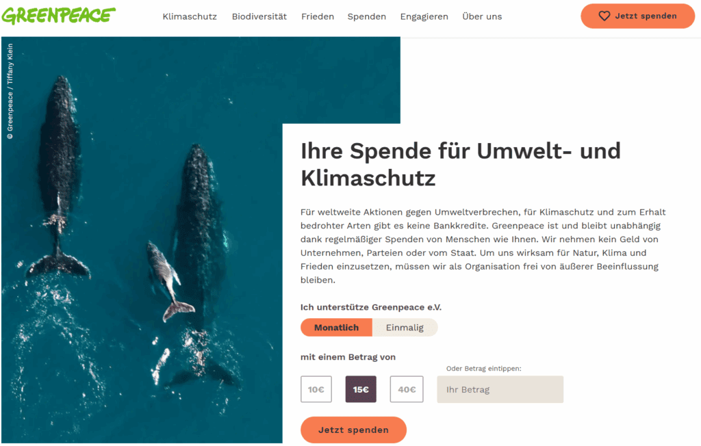 Neben Fördermitgliedschaften und Patenschaften setzt Greenpeace in der Vorauswahl auch auf monatliche Dauerspenden.