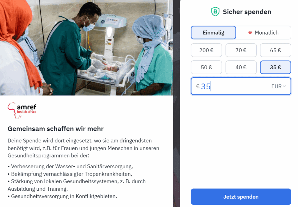 Amref Deutschland motiviert zu höheren Spenden durch Betragsvorschläge.