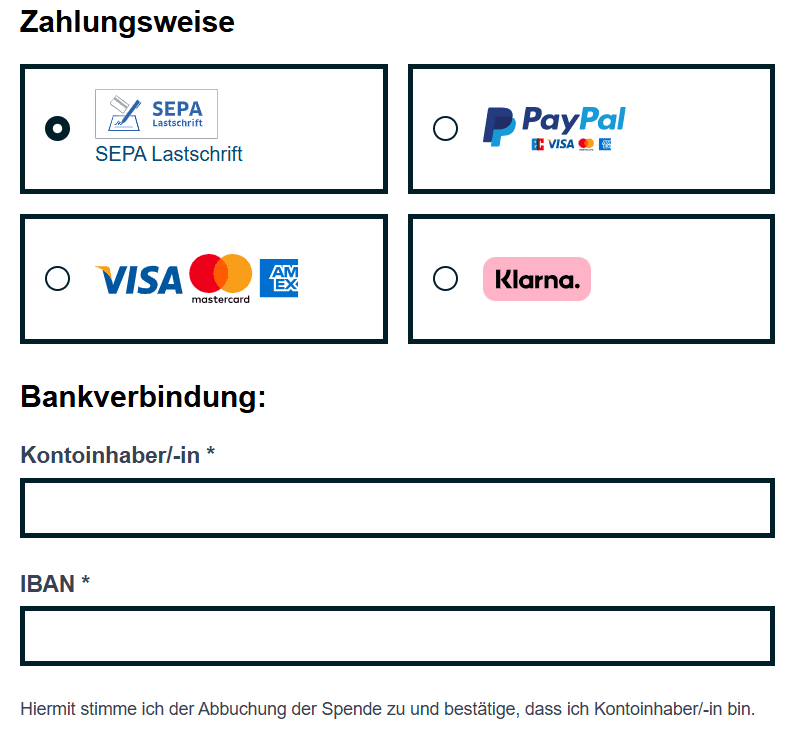 Je mehr Zahlungsmethoden im Formular angeboten werden, desto besser. Damit sinkt die Gefahr, dass potenzielle Spender*innen abspringen, weil ihre bevorzugte Zahlungsweise nicht dabei ist. Im Jahr 2025 sollten Sie keine Spender*in mehr verlieren, weil eine Zahlungsmethode auf Ihrer Spendenseite fehlt.