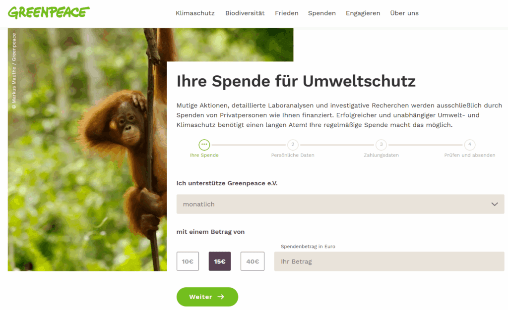 Neben Fördermitgliedschaften und Patenschaften setzt Greenpeace in der Vorauswahl auch auf monatliche Dauerspenden.