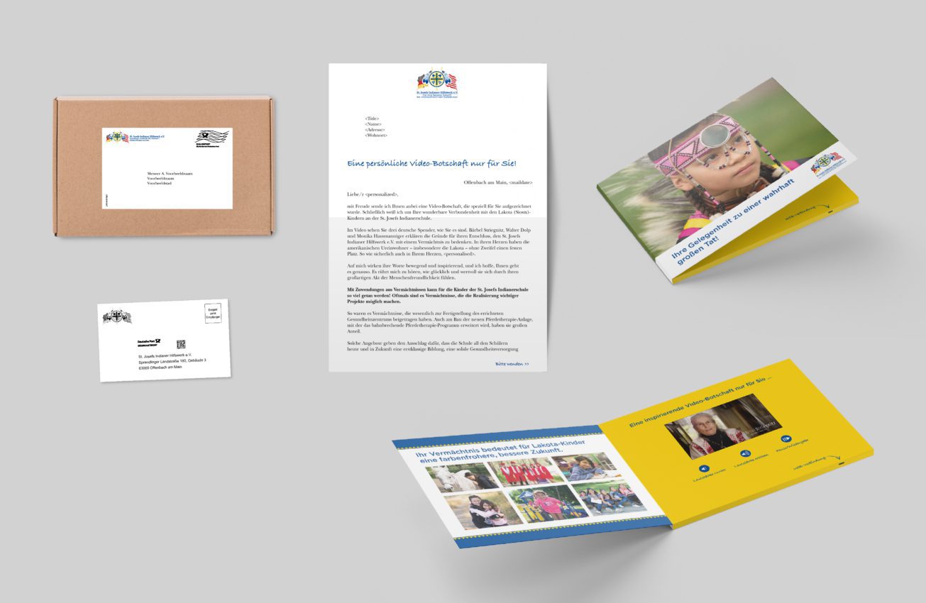 Where do you find people who want to include your organization in their will? In your own database. We made a selection of appropriate donors for St. Josefs Indianer Hilfswerk e.V. in Germany. These donors received an eye-catching mail pack: a video with testimonials from 3 donors who have already included St. Josefs Indianer Hilfswerk e.V. in their will. The video calls on the recipient to do the same.